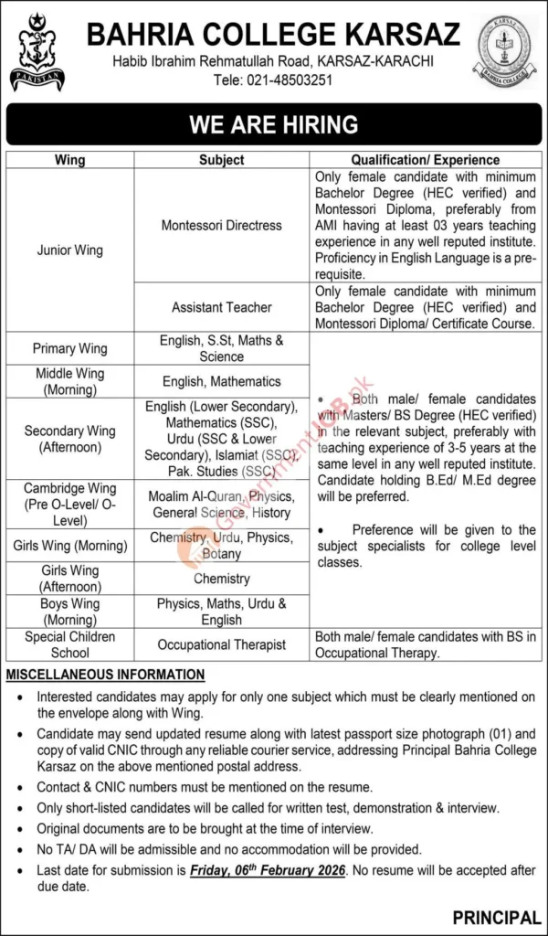 Note: This job posting is based on the official advertisement issued by Bahria College Karsaz. The final authority for selection, interpretation, and appointment rests with the Principal, Bahria College Karsaz. The college reserves the right to cancel, modify, or re-advertise any post without prior notice.