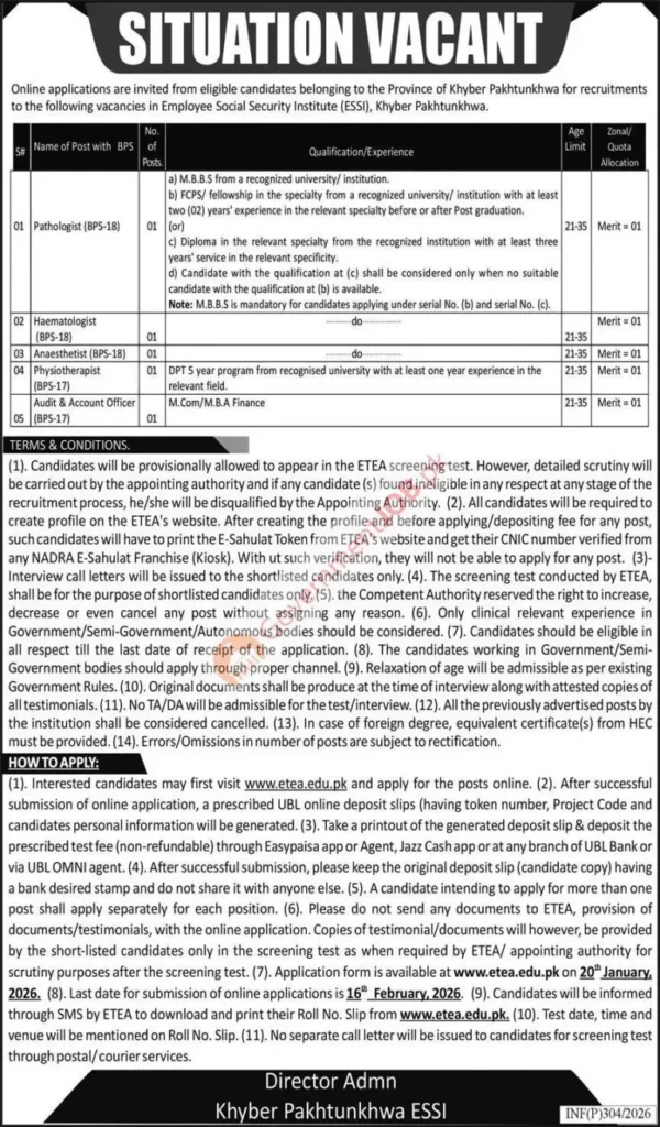 Note: This job posting is based on the official announcement by the Employees Social Security Institution (ESSI), Khyber Pakhtunkhwa. Recruitment is managed by ETEA under Government of KPK rules. ESSI reserves the right to modify or cancel the process without prior notice.