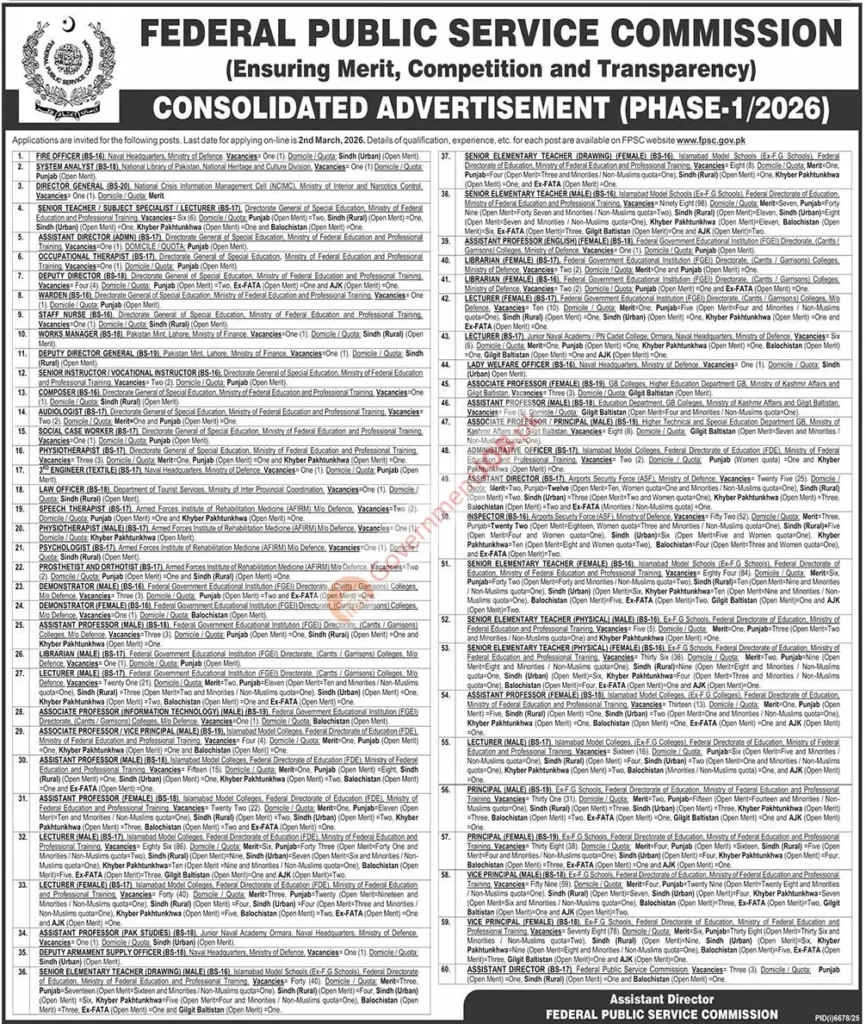 Posted On: February 16, 2026 | Organization: Federal Public Service Commission (FPSC) | Location: Islamabad (Nationwide Placements) | Job Type: Federal Government | Last Date to Apply: March 2, 2026