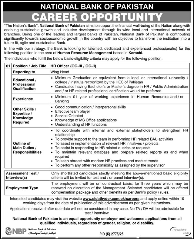 Education Requirement: NBP requires a minimum Bachelor’s degree for HR Officer roles, though the advertisement specifies preference for candidates holding Master’s or MS degrees in Human Resource Management, Business Administration (with HR specialization), or Psychology. BS graduates with concentrations in Organizational Behavior or Industrial Relations are also considered competitive. Crucially, degrees must be from HEC-recognized institutions—foreign qualifications require HEC equivalence certification prior to application. While not mandatory for entry-level HR Officer posts, certifications like PHRi, SHRM-CP, or IPMA-HR significantly strengthen applications given NBP’s focus on international HR standards.