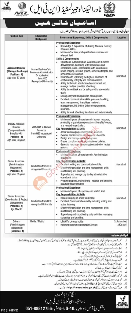 Working under the broader NADRA ecosystem and aligned with national initiatives such as Uraan Pakistan, NADRA Technologies Limited offers excellent career opportunities for experienced professionals seeking stability, growth, and meaningful contribution to Pakistan’s digital identity infrastructure.