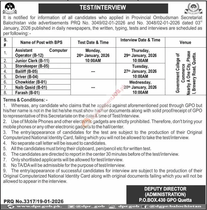 Disclaimer: This article is compiled for informational purposes based on the official notices referenced (PRQ Nos. 3049/02-01-2026, 3048/02-01-2026, and schedule ref. PRQ No. 3317/19-01-2026). Candidates are strongly advised to refer to the original official advertisements and notices published by the Provincial Ombudsman Secretariat Balochistan for complete and authoritative information. In case of any discrepancy between this article and the official notification, the official notification shall prevail. The author and publisher assume no responsibility for any errors or omissions, or for any actions taken based on the information provided in this article.