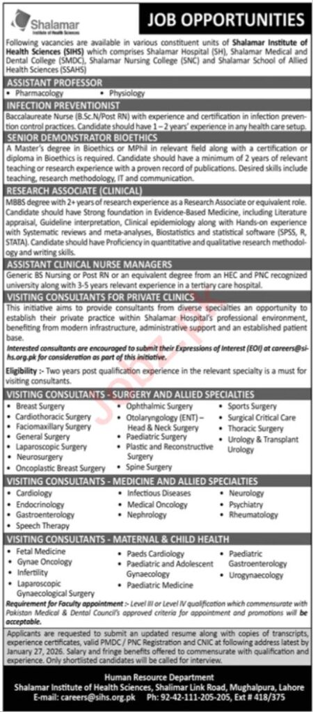 Shalamar Institute of Health Sciences (SIHS), a well-reputed private-sector healthcare and academic institution located in Mughalpura, Lahore, has announced multiple full-time and visiting career opportunities for 2026. The vacancies span across clinical leadership, nursing management, infection control, research, medical education, and consultancy roles.