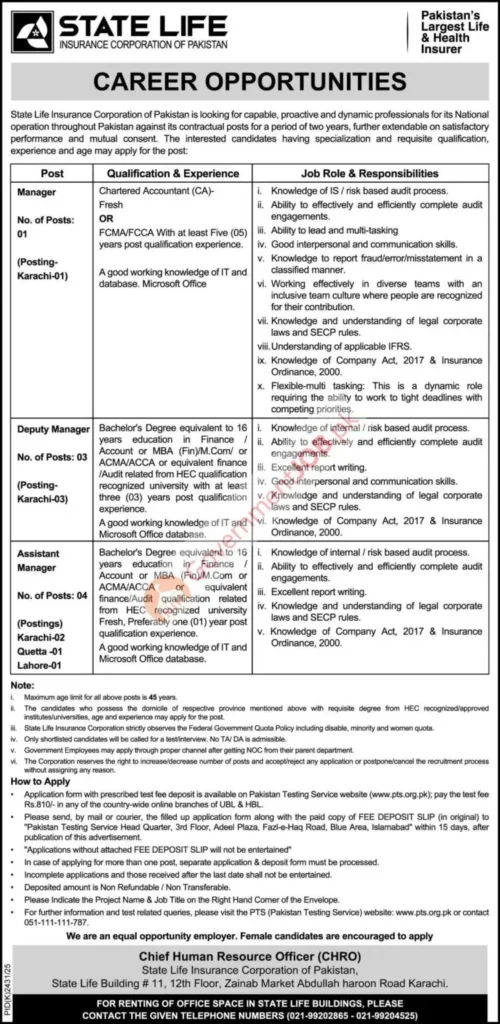 Applications are being processed through the Pakistan Testing Service (PTS), and candidates must apply within 15 days of the advertisement. These roles are ideal for professionals searching for State Life Insurance jobs 2026, audit & compliance careers in Pakistan, insurance sector finance jobs, and risk management roles in Karachi, Lahore, and Quetta.