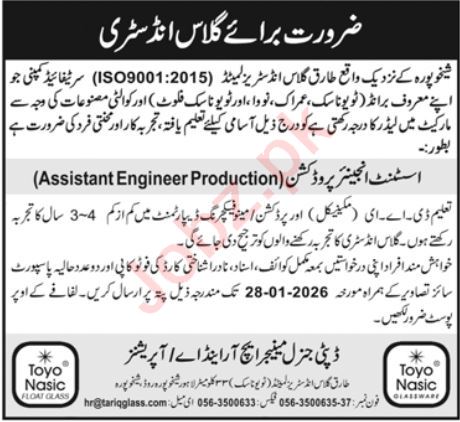 Tariq Glass Industries Limited, one of Pakistan’s leading glass manufacturing groups, has announced a new full-time career opportunity for 2026. As per the advertisement published in the daily Jang Newspaper on January 19, 2026, applications are invited for the post of Assistant Engineer (Production).